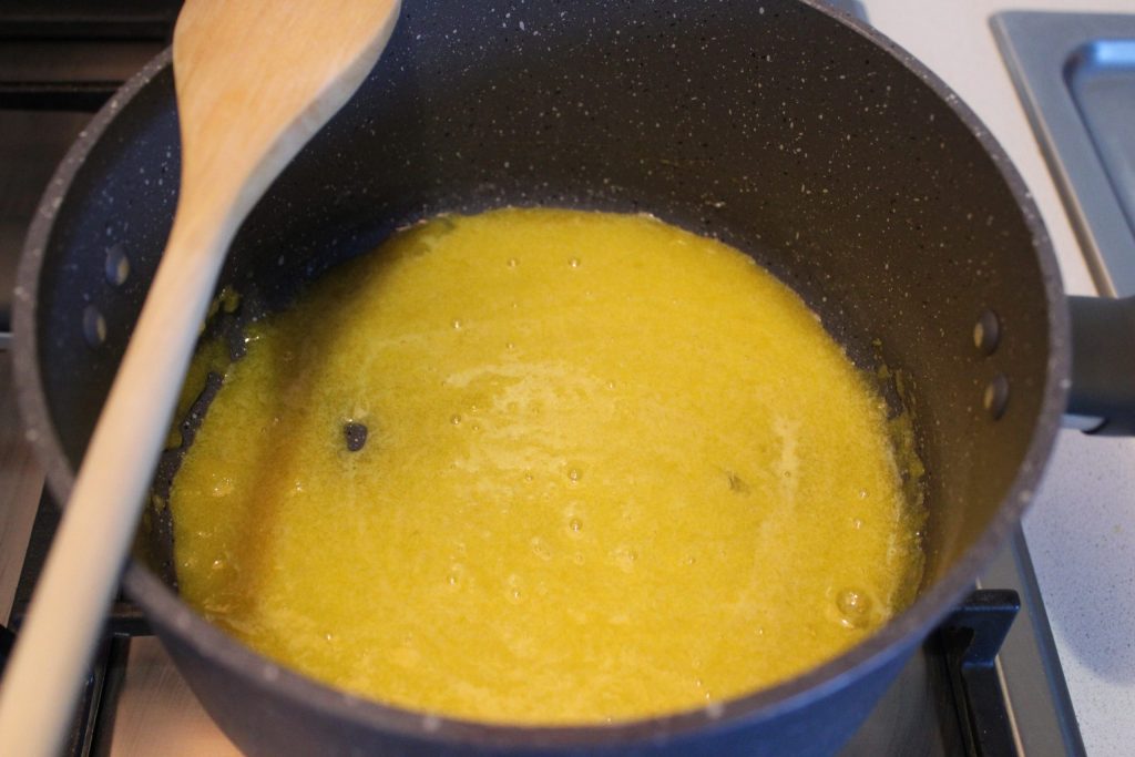 Em outra panela, aqueça o leite e quando ferver, desligue o fogo e adicione-o aos poucos à panela que agora será colocada no fogo baixo. Eu adicionei então um sachê de vanilina e continuei a mexer o creme com o batedor até que ficasse bem misturado e espesso. Isso levará cerca de 7/8 minutos.