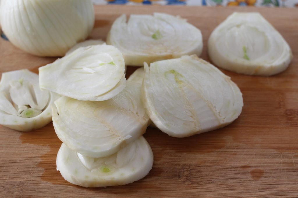 • Para preparar os empanados de funcho assados, primeiro lave bem os funchos em água corrente e retire a parte dura de cima e de baixo. Corte em fatias não muito finas nem muito grossas. Em um prato, bata 1 ovo com uma pitada de sal; em outro prato coloque 4 colheres de farinha de rosca e 2 colheres de farinha de trigo tipo 00. Acrescente 2 colheres de chá de pecorino romano ralado. Passe as fatias de funcho primeiro no ovo batido e depois na mistura de farinha de rosca.