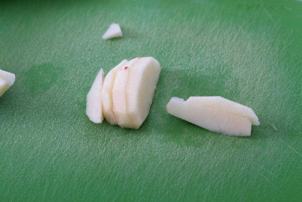 Agora pegue o rolo de massa filo. Eu encontrei no supermercado um com folhas grandes, então dividi cada folha em 3 partes. Se você tiver um menor, pode dividi-lo em 2 partes. Pegue a primeira folha e pincele com água, sobreponha a segunda folha e pincele levemente com água para que fiquem grudadas entre si. Recheie o centro com uma colher generosa de maçãs, depois feche as bordas laterais em direção ao centro.