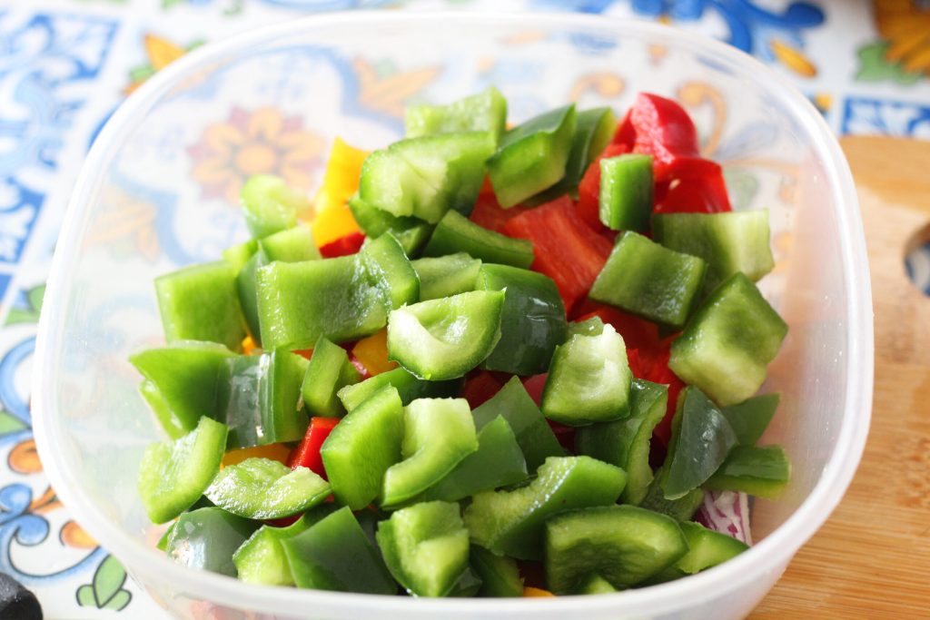 Você pode escolher as cores dos pimentões que preferir; eu usei os três para deixar o prato mais colorido.