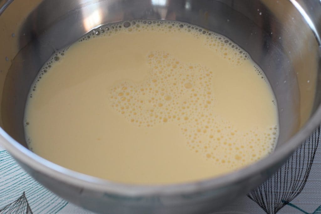 • Para preparar o smacafam, primeiro pegue os ovos, quebre-os em uma tigela e bata com um batedor de arame. Adicione aos poucos o leite integral, sempre mexendo a mistura. Agora pese a farinha 0 e peneire-a. Incorpore aos poucos, mexendo sempre para não formar grumos. Quando toda a farinha estiver incorporada, adicione sal e pimenta-do-reino preta moída. Eu não coloco muito porque não gosto do sabor muito forte, mas, se quiser, pode adicionar mais pimenta.