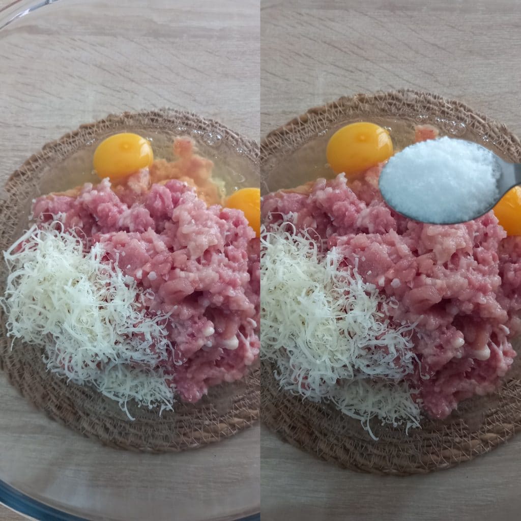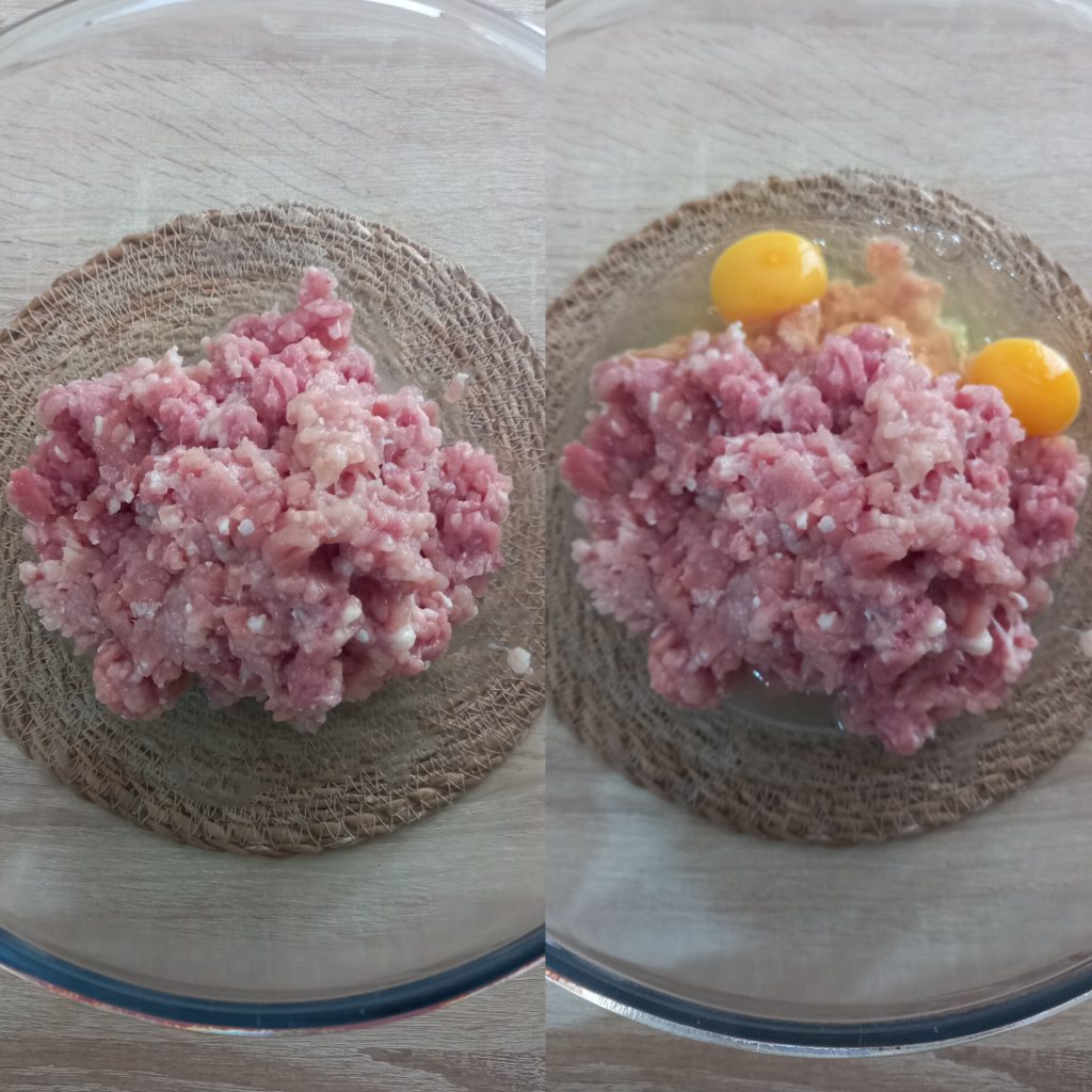 Primeiro coloque a carne moída de frango e os ovos em uma tigela.