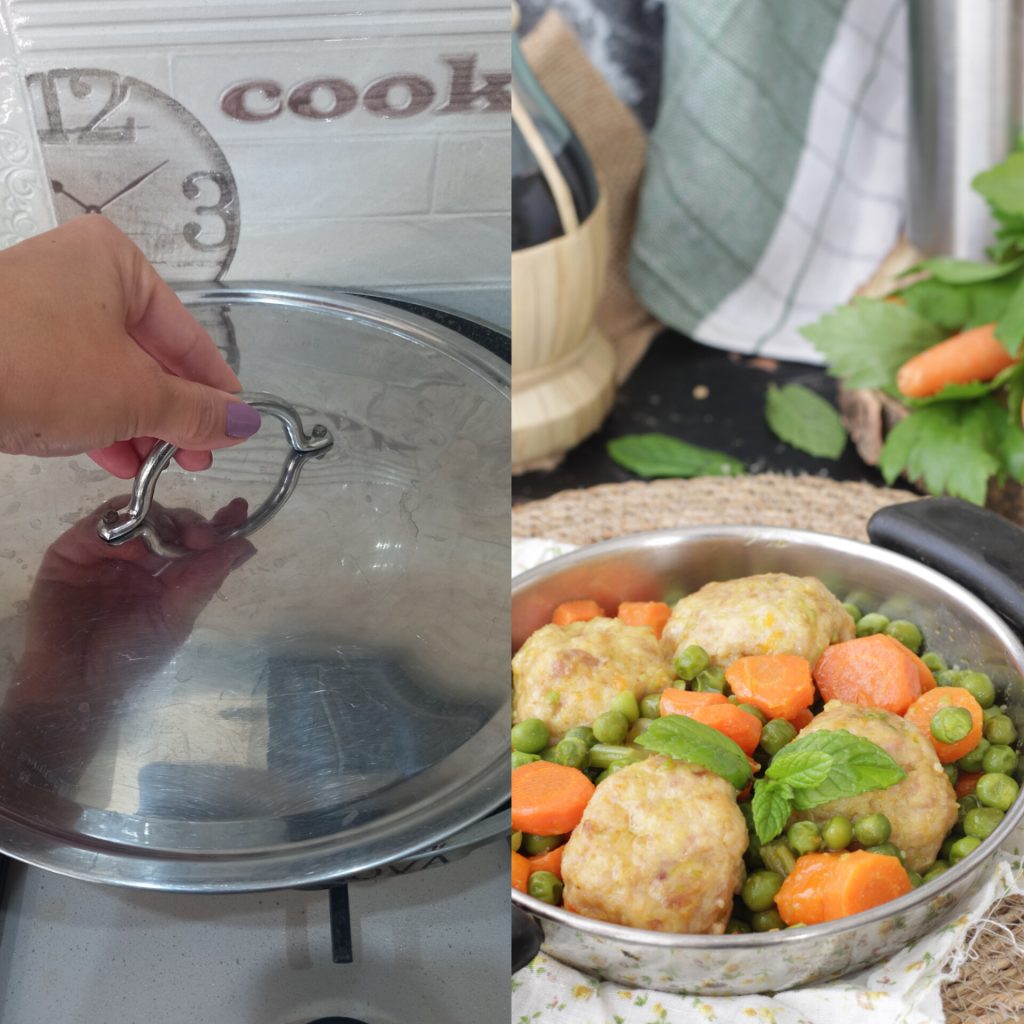 Preferi cozinhar as almôndegas de frango com cenouras, aipo e ervilhas para torná-las macias e saborosas. Um prato principal rápido que vai agradar toda a família!