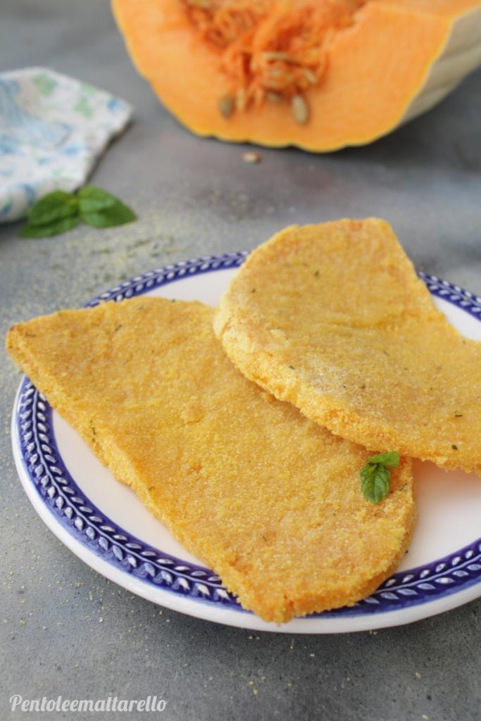 A abóbora é um fruto que se presta a inúmeras receitas porque pode ser cozida de várias formas. Eu decidi criar a receita de bife de abóbora, que com sua crosta e o uso de algumas especiarias, te dará a oportunidade de trazer à mesa um acompanhamento saboroso e bonito de se ver. São feitas com fatias grossas de abóbora, passadas primeiro no ovo e depois na farinha de milho, são deliciosas e ficam prontas em menos de meia hora!