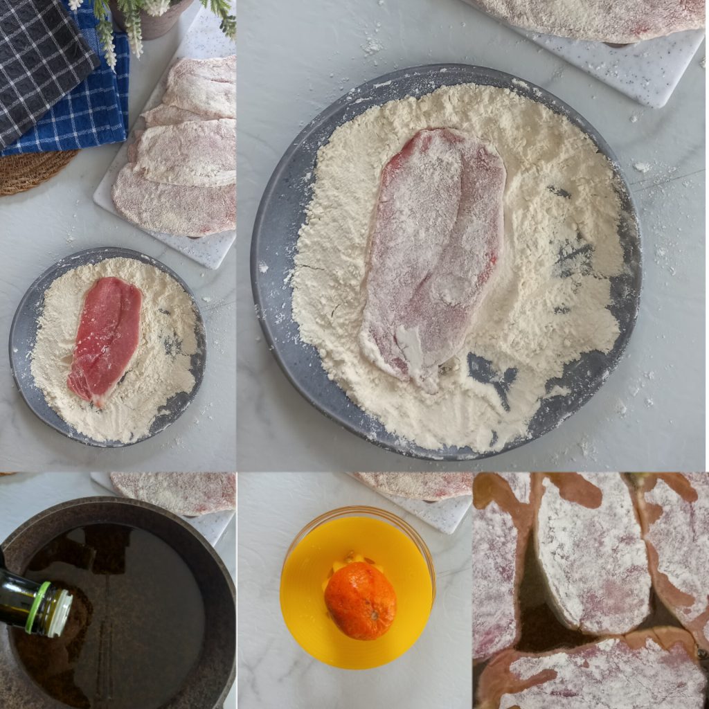 • Primeiro, pegue um prato e coloque a farinha. Empane as fatias de lombo dos dois lados.