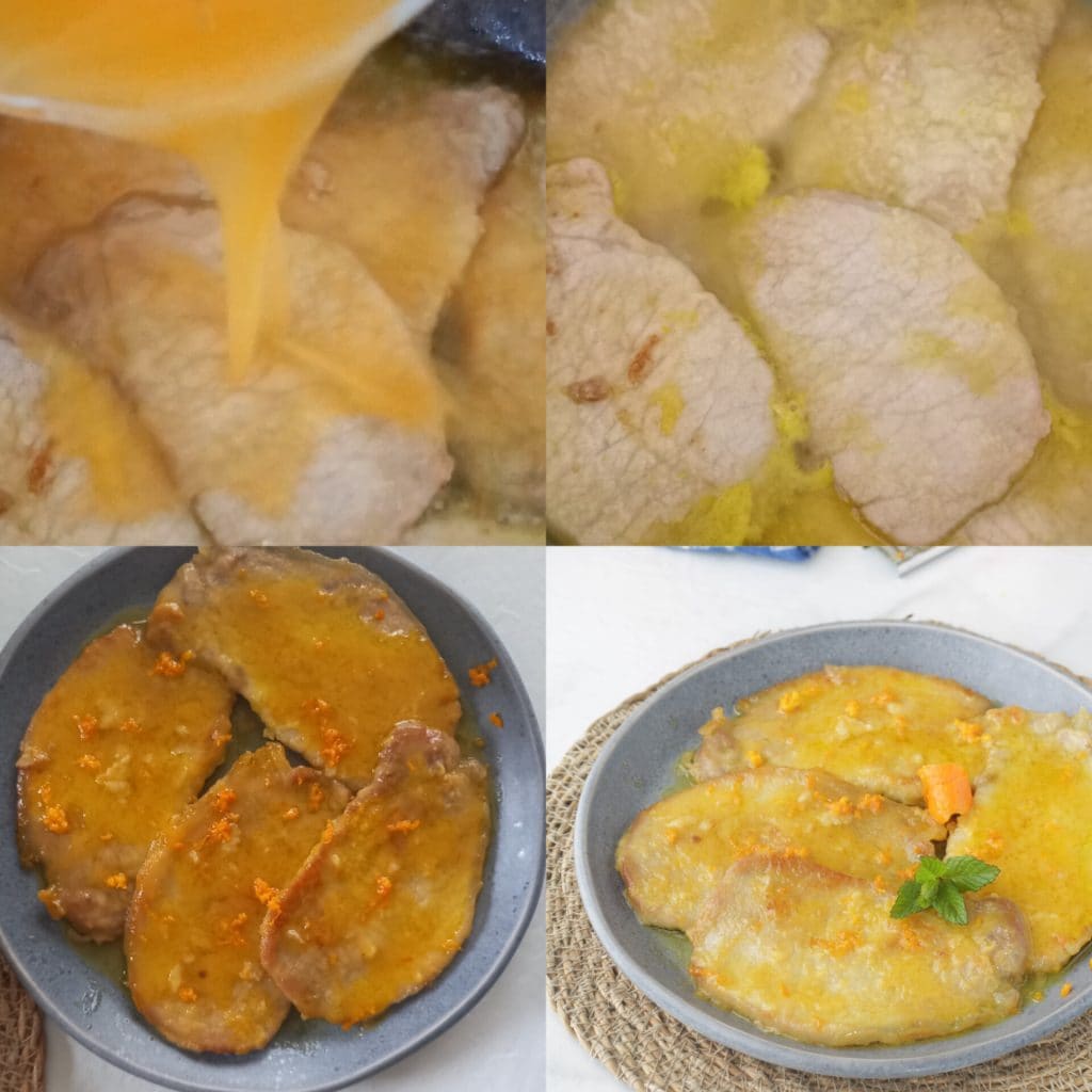 • Despeje o suco de laranja sobre a carne e deixe evaporar por 5 minutos em fogo baixo.