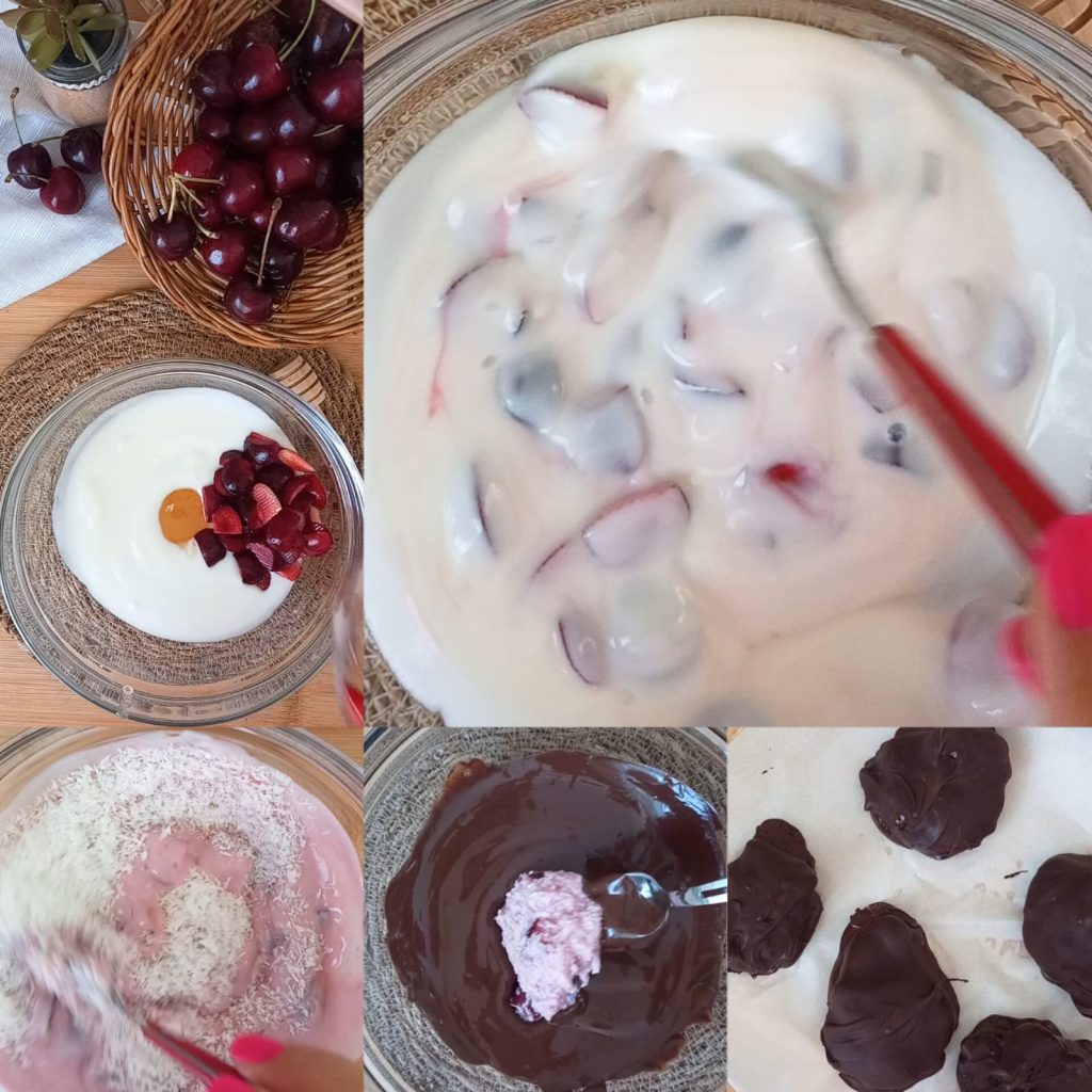 Desta vez, eu quis preparar esses mini sorvetes de iogurte, coco e cerejas, uma sobremesa deliciosa e rápida.