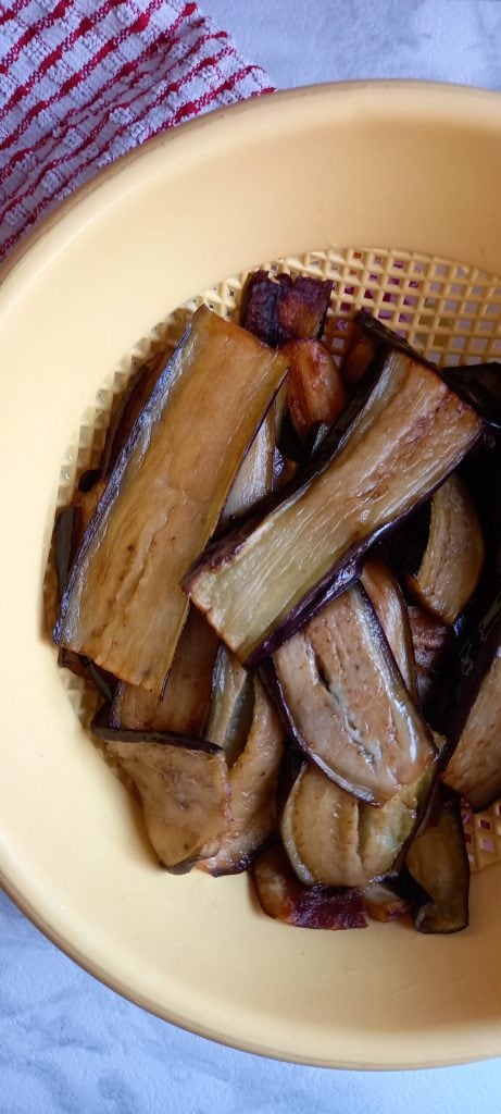 • À medida que as berinjelas estão prontas, pegue um escorredor ou bandeja com papel para frituras e deixe escorrer o excesso de óleo. Este procedimento pode ser feito no dia anterior.