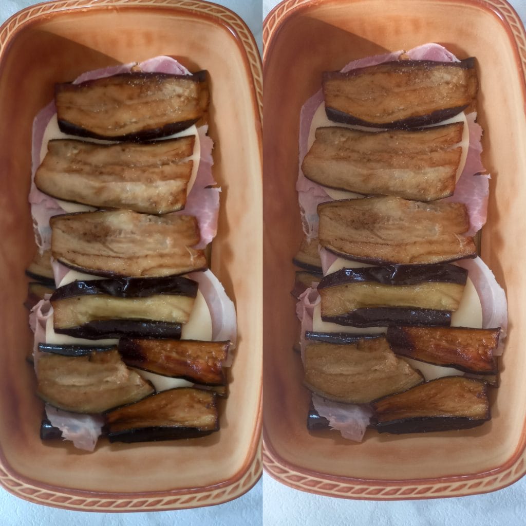 • E duas fatias de provolone. Se quiser, pode adicionar uma pitada de parmesão. Cubra com a segunda camada de berinjelas colocando-as na horizontal.