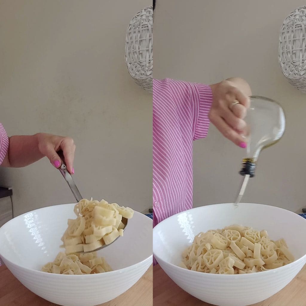 Escorra a massa e deixe esfriar completamente (você pode passar a massa em água fria por alguns segundos). Coloque a massa em uma tigela grande, adicione um fio de azeite e misture delicadamente.