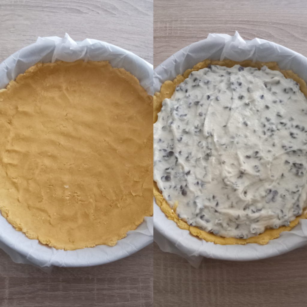 Pegue uma forma redonda de 22-24 cm, unte e enfarinhe bem ou use uma folha de papel manteiga. Despeje metade da massa no fundo até cobri-lo totalmente e pressione com as mãos.