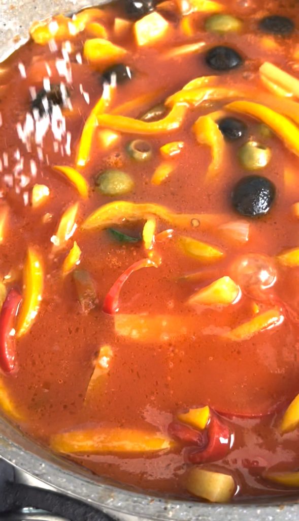 Neste ponto, adicione os pimentões, mexa e cozinhe por mais 5 minutos.