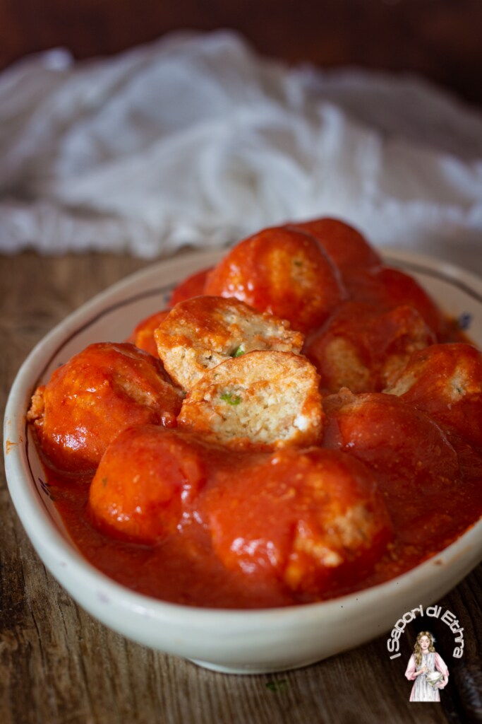Hoje Almôndegas de ricota ao molho, um dos meus pratos principais favoritos, de uma maciez única e quando você prova uma almôndega é inevitável comer todas quase do jeito que estão.. Experimente porque são realmente simples e deliciosas de fazer. Além disso, este segundo resolve o problema de o que fazer primeiro, pois este molho é um ótimo tempero para massas. Eu realmente fiz espaguete com molho com almôndegas de ricota super macias e gostosas. Mas voltando a essas deliciosas almôndegas. Você escolhe naturalmente o tamanho, eu prefiro grandes, mas se preferir pode fazer menor. Eu as cozinhei diretamente no molho, não as fritei antes como a maioria das almôndegas pugliesas. O importante nesta receita, além de sua simplicidade, é a qualidade dos ingredientes, em particular a ricota que deve ser marzótica. O termo “marzótica” refere-se ao mês em que ocorre a maior produção, especialmente quando as ovelhas começam a pastar os tenros pastos primaveris e fornecem o leite mais rico. Outro ingrediente importante é o pão. Nesta receita eu adicionei o pão de Laterza, motivo de orgulho pugliese, feito com fermento natural, farinha de sêmola de trigo duro remacinada, água, sal. Naturalmente, você pode usar tranquilamente o pão da sua região. Enfim, amigos, experimente essas almôndegas de ricota ao molho e bom apetite a todos.