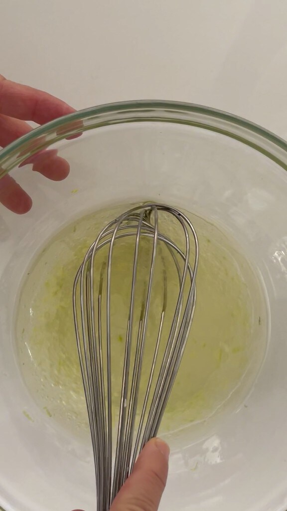 Em outra tigela, coloque os líquidos, ou seja, a água morna, o óleo e rale a casca de um limão orgânico.