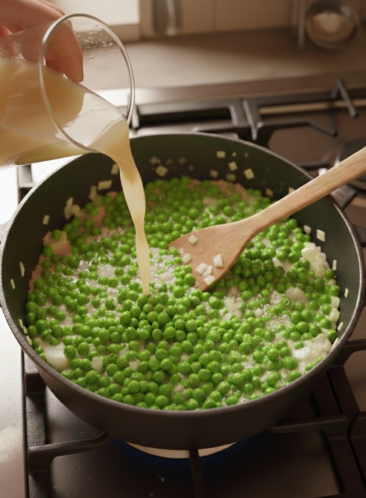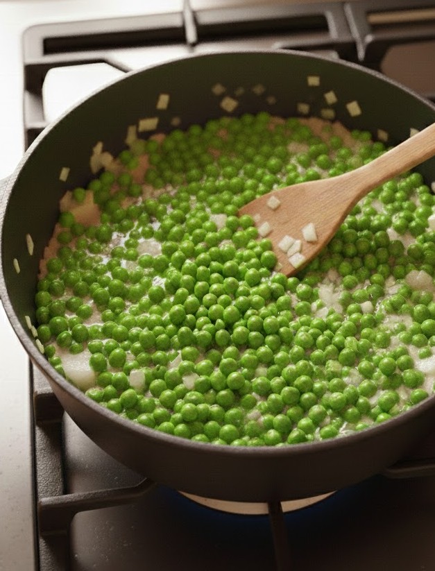 Comece pelo preparo das ervilhas. Em uma panela, refogue a cebola com azeite e adicione as ervilhas