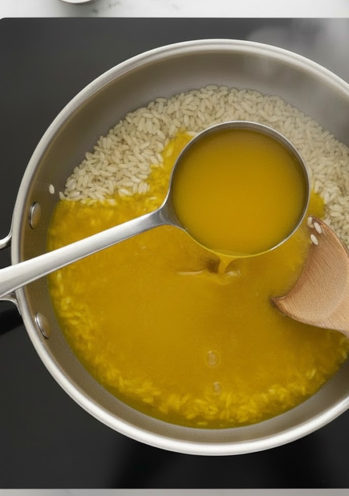 Quase no final do cozimento do risoto, adicione mais caldo com o pó de açafrão dissolvido.