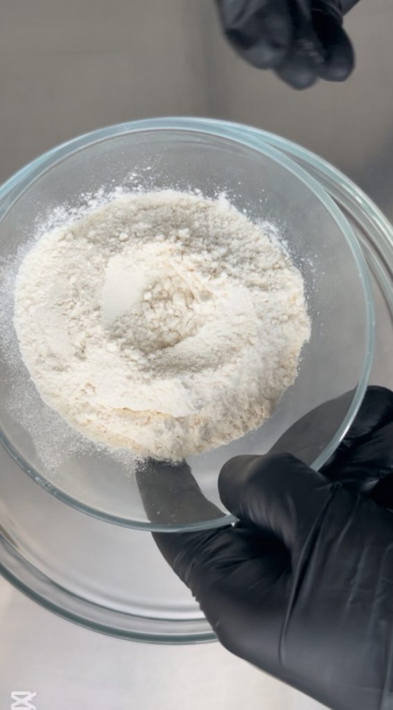 Em uma tigela, misture as farinhas peneiradas, fécula de batata, cacau e fermento.