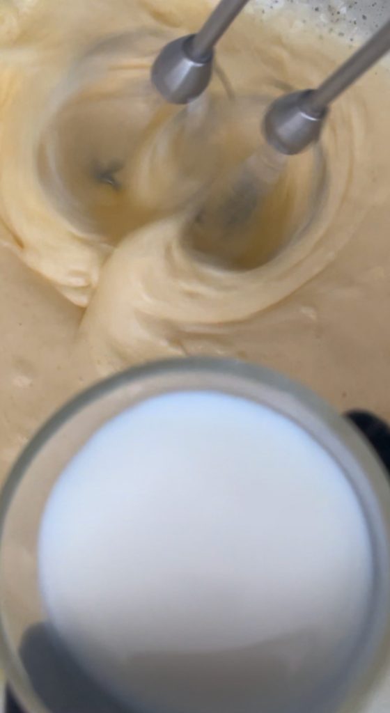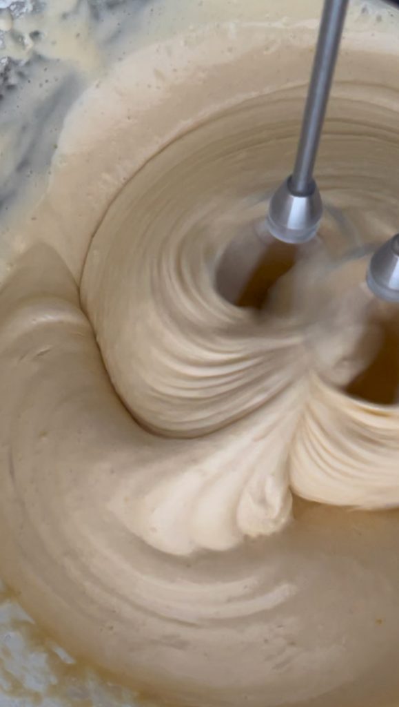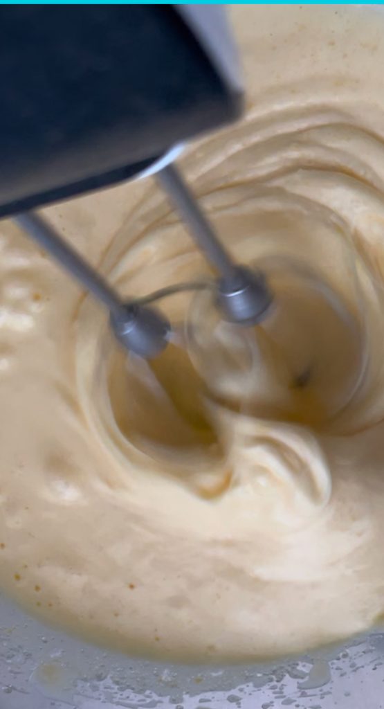 Em uma tigela, misture com a batedeira elétrica o açúcar com os ovos