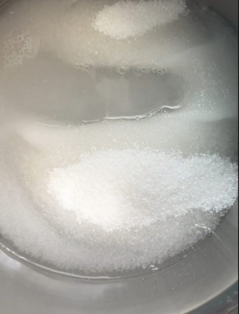 Faça primeiro o xarope colocando em uma panela o açúcar com a água. Aqueça até que o açúcar se dissolva.