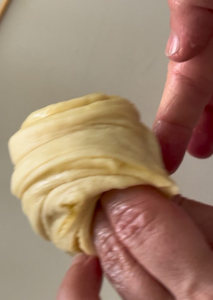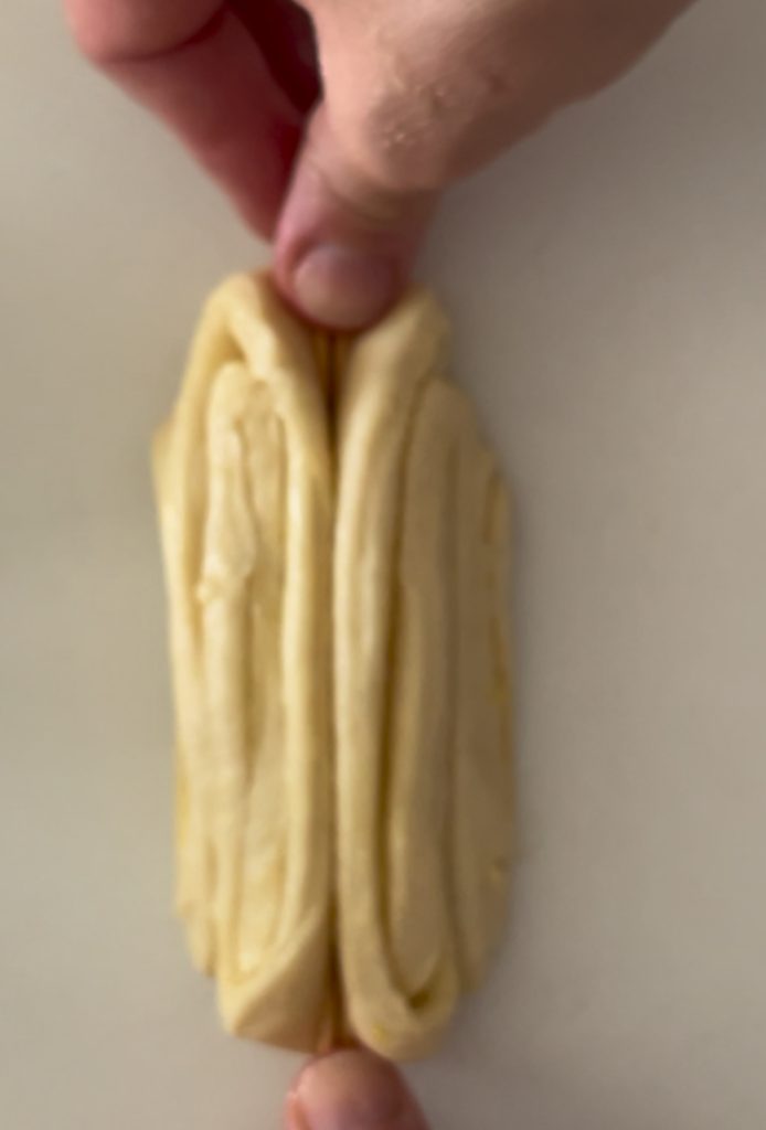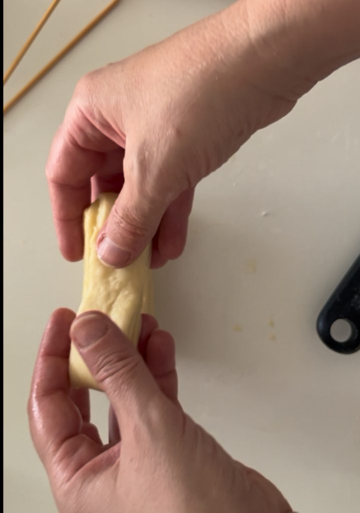 Estenda e enrole a massa entre as mãos e feche bem embaixo