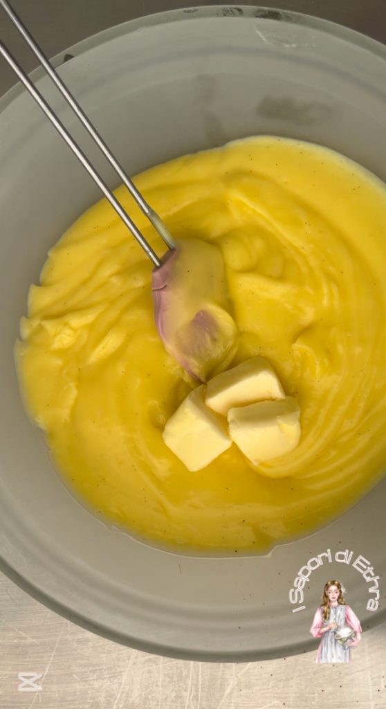 Quando a creme ainda estiver quente, adicione a noz de manteiga. Deixe a creme esfriar bem, coberta com filme plástico na superfície.