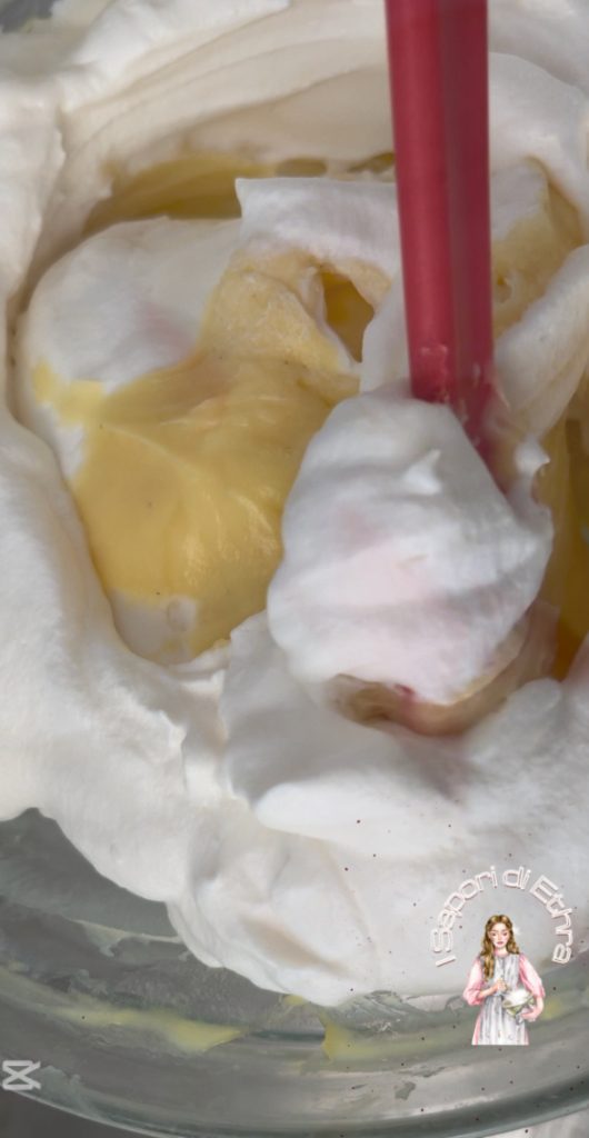 Quando a creme estiver fria, adicione o creme de leite em movimentos de cima para baixo e a nossa creme diplomática está pronta para uso. Deliciosa também para comer com uma colher.