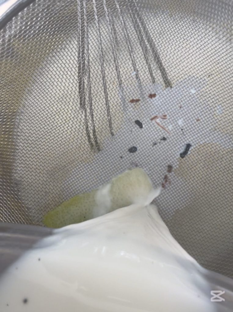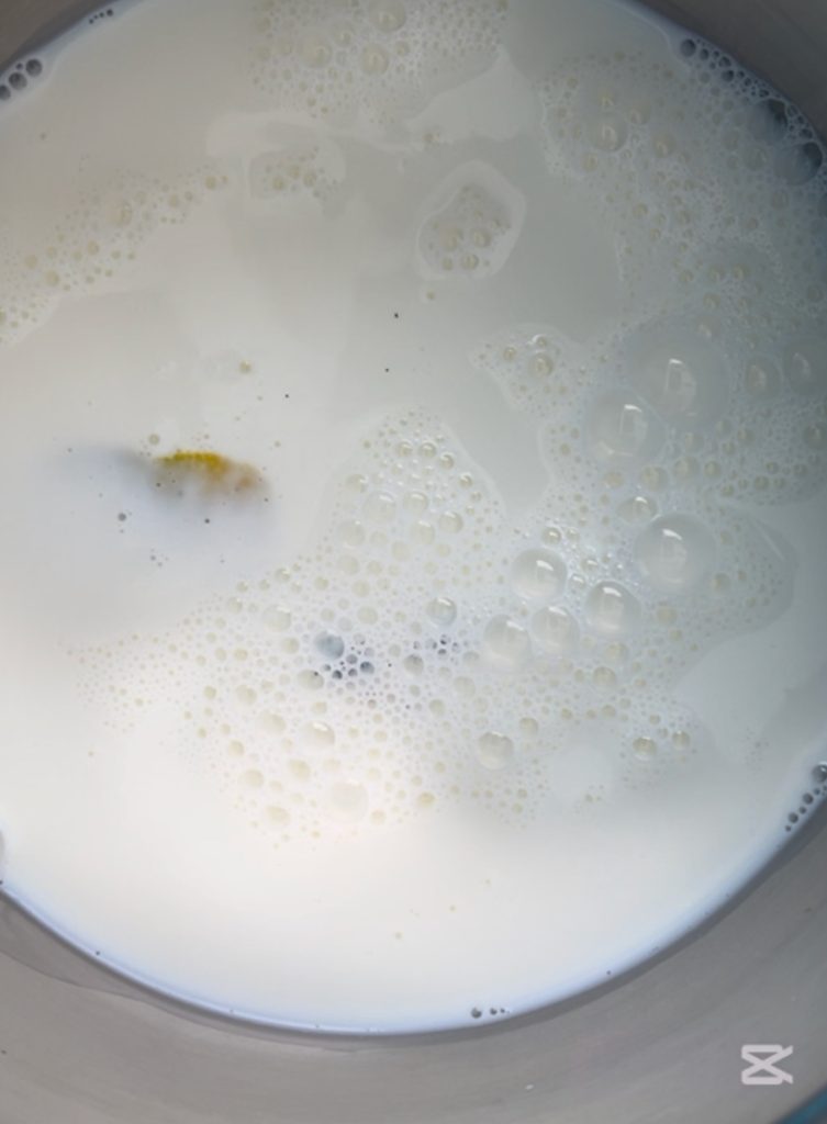 Despeje na tigela o leite quente coado para eliminar a casca de limão e as sementes