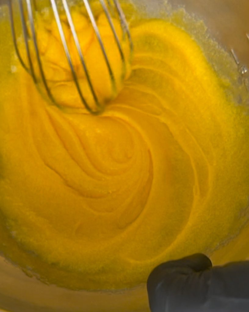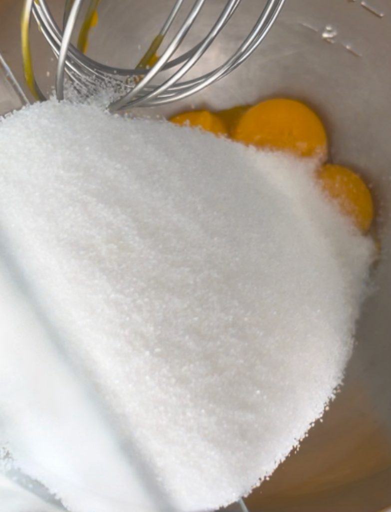 Enquanto isso, em uma tigela, misture o açúcar com as gemas