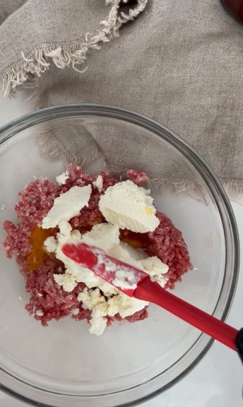 Em uma tigela, coloque a carne moída, o sal e o Grana Padano.