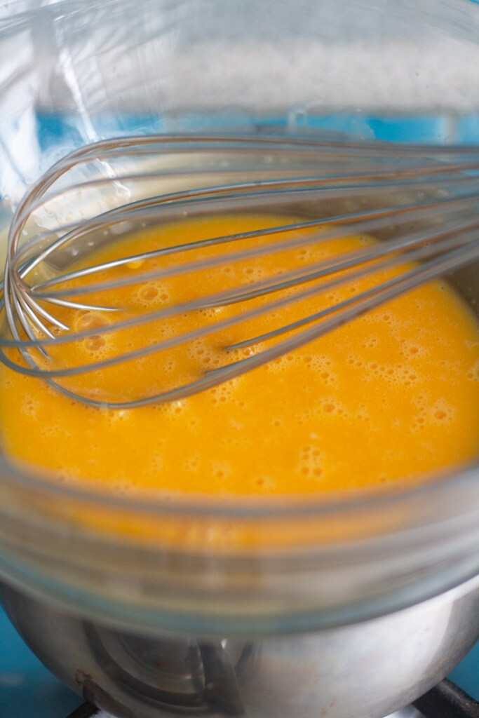 Pasteurize os ovos adicionando duas colheres de água morna às gemas, e pasteurize em banho-maria a 60 graus, batendo levemente com um batedor por alguns minutos. (Você pode evitar se quiser, eu fiz por zelo, mas pode ser tranquilamente evitado, uma vez que os ovos serão cozidos no forno)