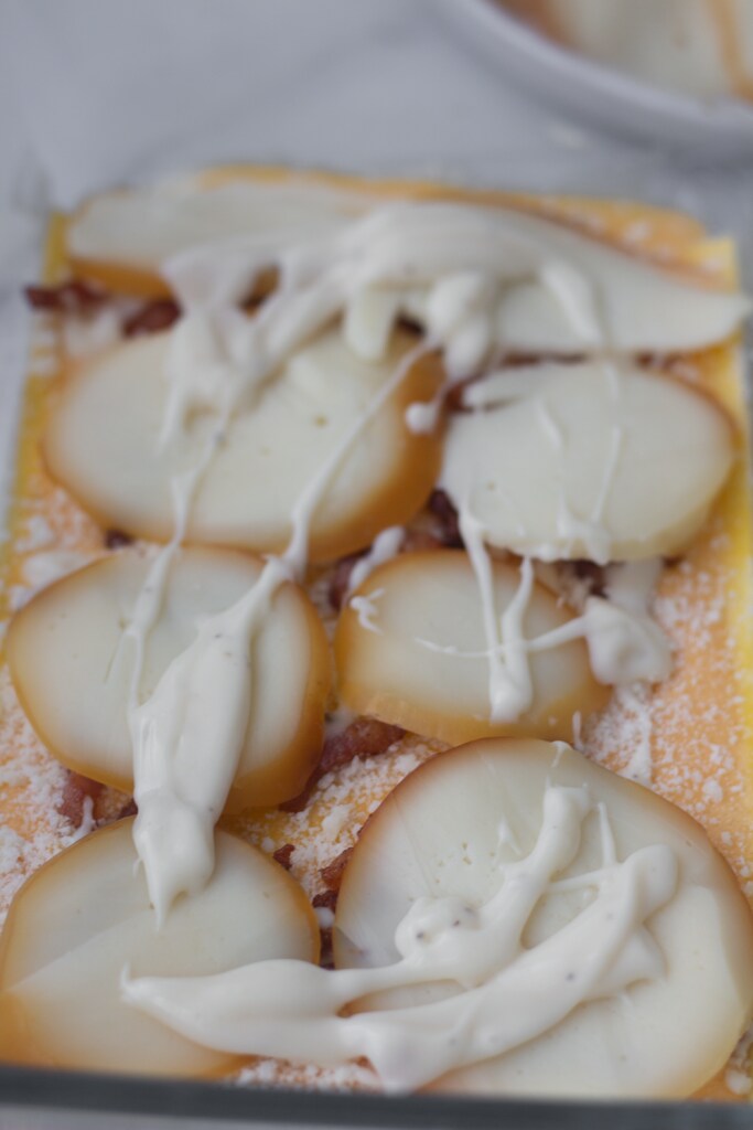 e recomeçar com a fatia de lasanha com creme de ovo, o pecorino, o guanciale, bechamel e scamorza. Continuar e repetir até chegar a 4 camadas de lasanha e terminar com mais um pouco de creme de ovo