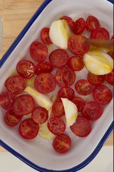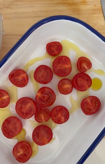 Corte os tomatinhos e coloque-os com a parte das sementes para cima.