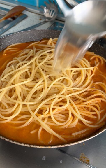 Adicione mais algumas conchas da água do macarrão e misture mais.