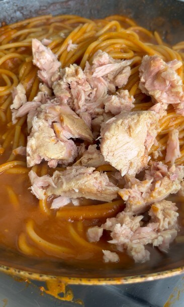 Quase no fim do cozimento, adicione o atum, misture bem e sirva