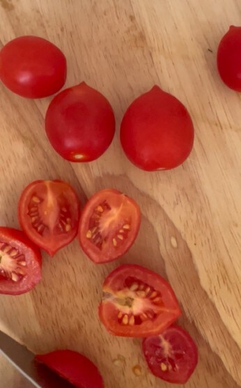 A primeira coisa a fazer são os confit. Então, corte os tomatinhos ao meio.