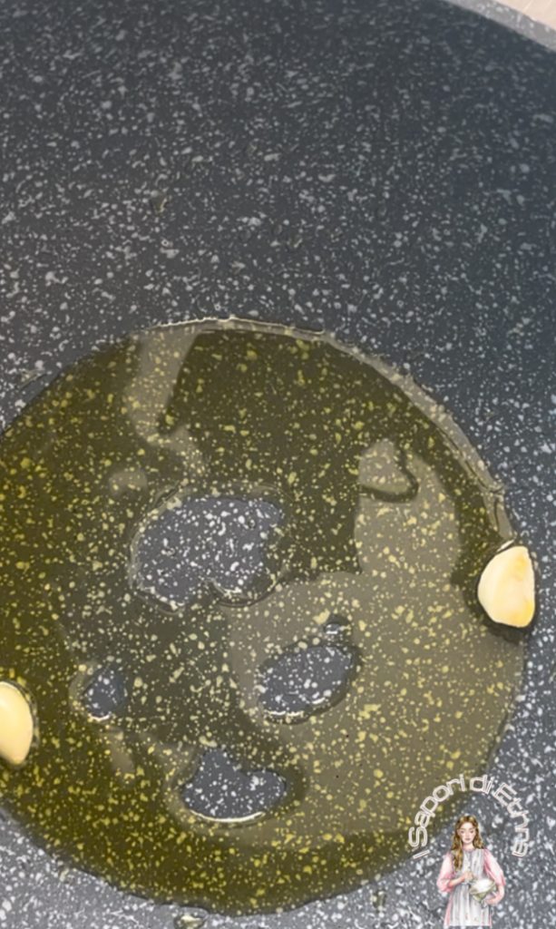 Em uma frigideira, aquecer o azeite com um dente de alho.
