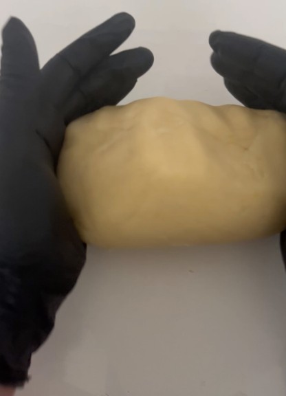 Trabalhe a massa na bancada até formar um bloco liso e homogêneo. As mãos ficarão secas, ou seja, a massa não gruda nas mãos quando trabalhada.
