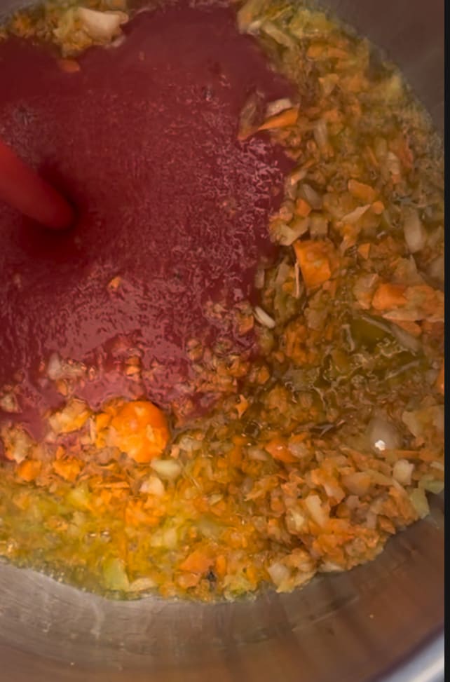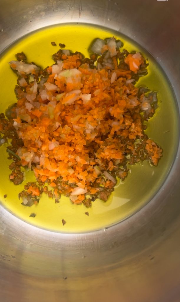Em uma caçarola, refogue a cebola e a cenoura picadas finamente com o azeite.