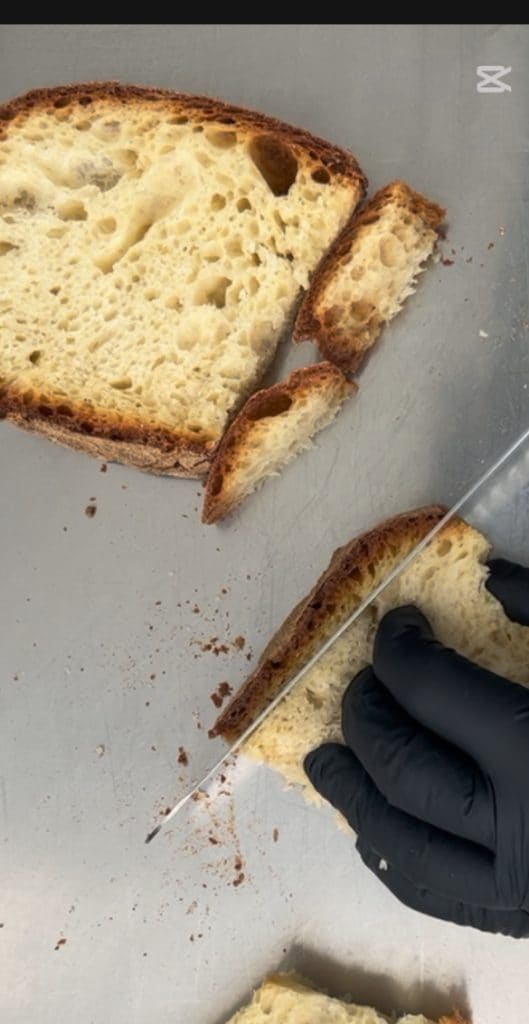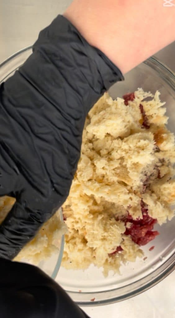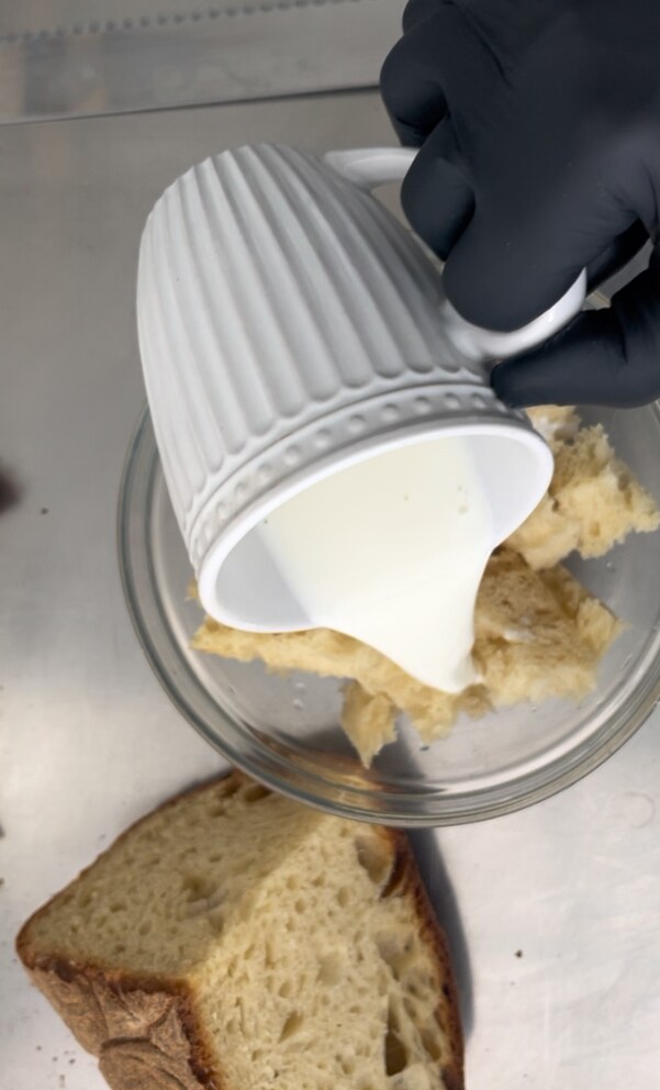 Enquanto isso, prepare as almôndegas. Corte o pão dormido em tiras e pedaços.