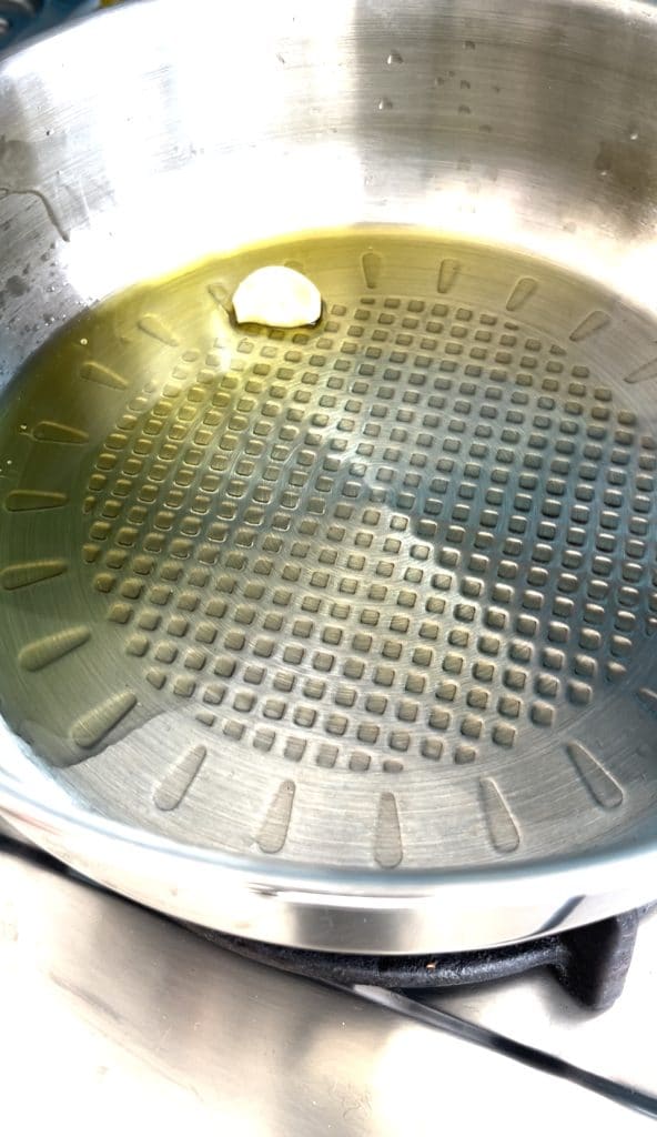 Em uma frigideira, aquecer o azeite com o dente de alho.