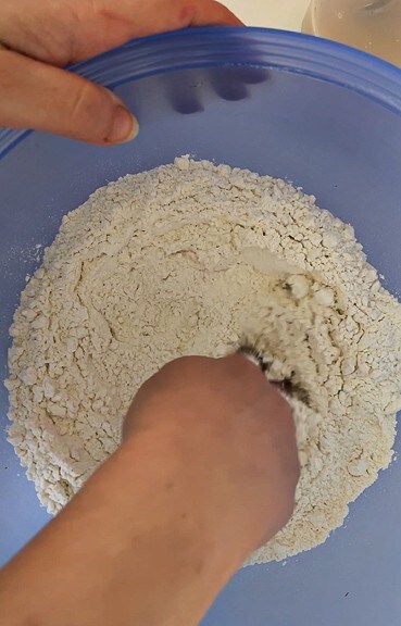 Comece colocando em uma tigela alta, para trabalhar bem a massa, a farinha. Faça um buraco no centro