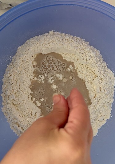 Despeje os 100 ml de água quente, onde dissolvemos o fermento