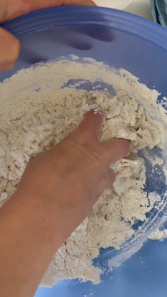 Aos poucos, continue amassando, adicione os 400 ml de água