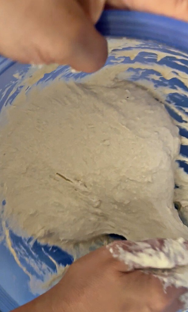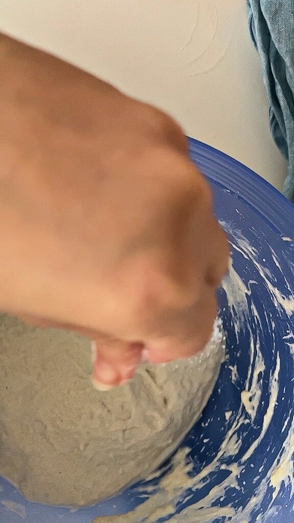 Bata a massa energicamente por cerca de 10 minutos, com movimentos de baixo para cima, até que se formem bolhas. Isso é o sinal de que a massa está pronta para descansar