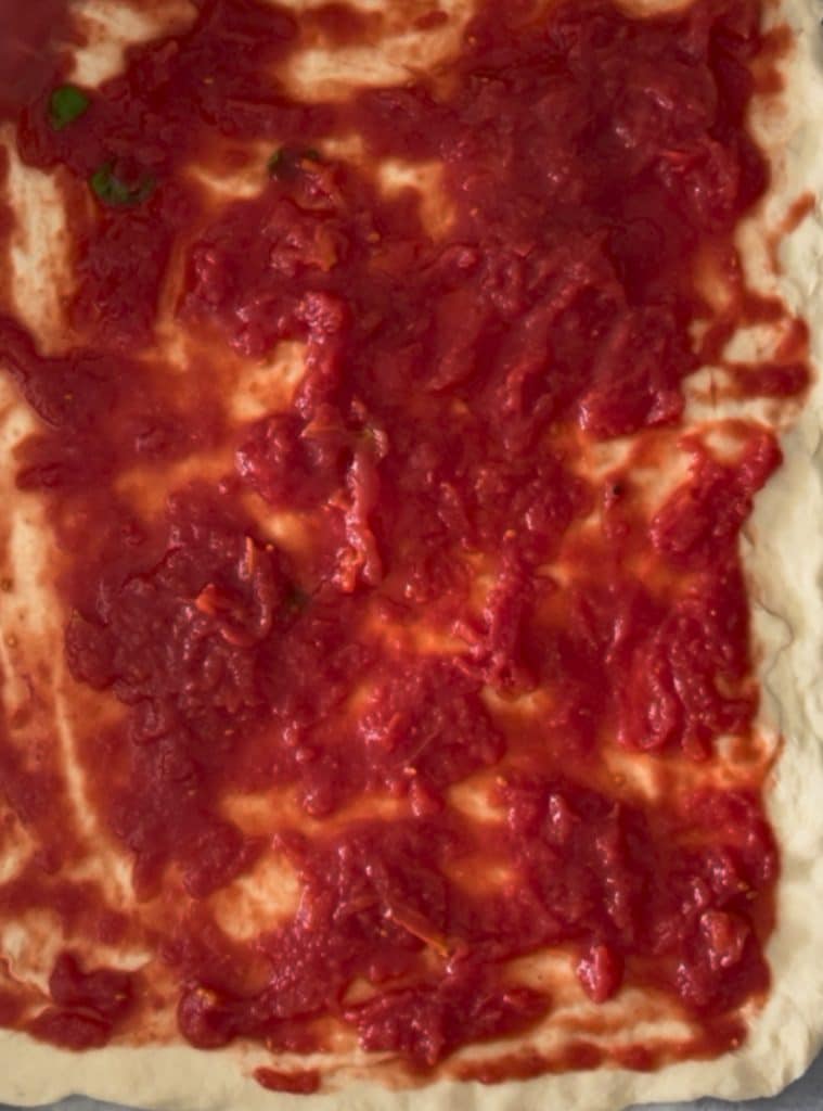 Com as mãos, amasse o tomate pelado, tempere com sal, azeite e distribua sobre a massa, afastando-se um pouco da borda.