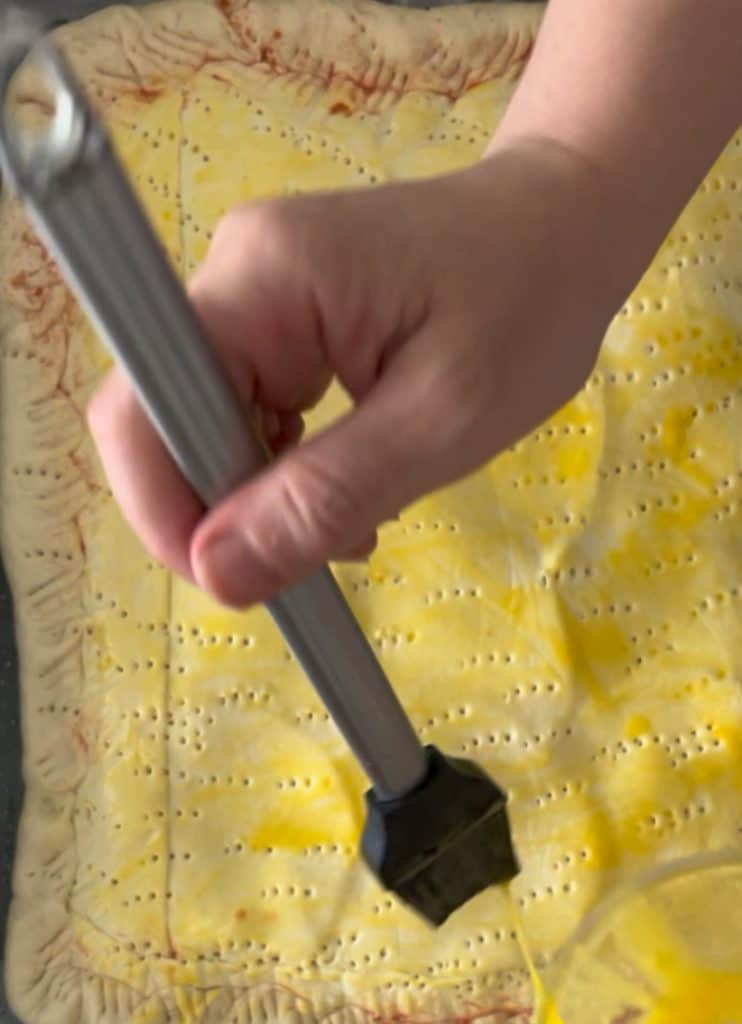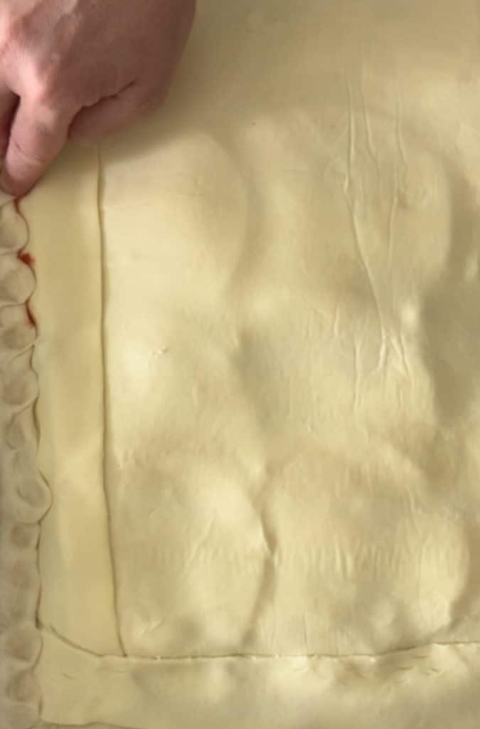 Cubra com a folha retangular de massa folhada. Sele as laterais e fure a massa com um garfo