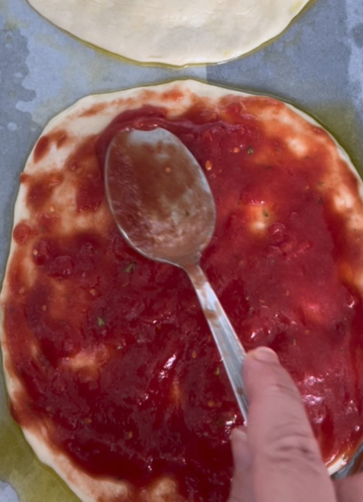 temperar com o tomate generosamente até as bordas e assar as pizzettes na temperatura máxima do seu forno, o meu 250 graus, inicialmente na base do forno por 12 minutos e os últimos três minutos em cima por 3 minutos.