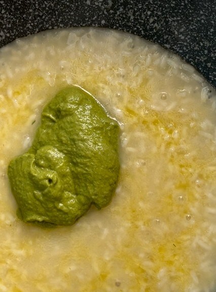 Adicione a água de cozimento das folhas de nabo quente (usada para cozinhar as folhas e preparar o creme) sempre que o arroz precisar.