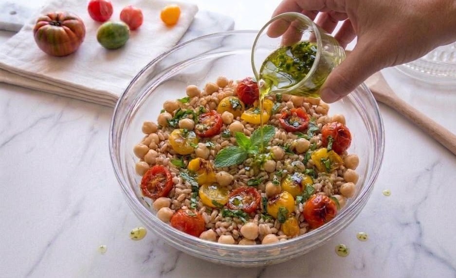 Tempere com uma mistura de azeite extra virgem, suco de limão, sal e manjericão. Misture bem, deixe descansar alguns minutos e sirva nossa salada de cevada com grão-de-bico e tomatinhos amarelos e vermelhos.