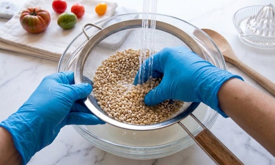 Lave a cevada perlada até a água ficar limpa.